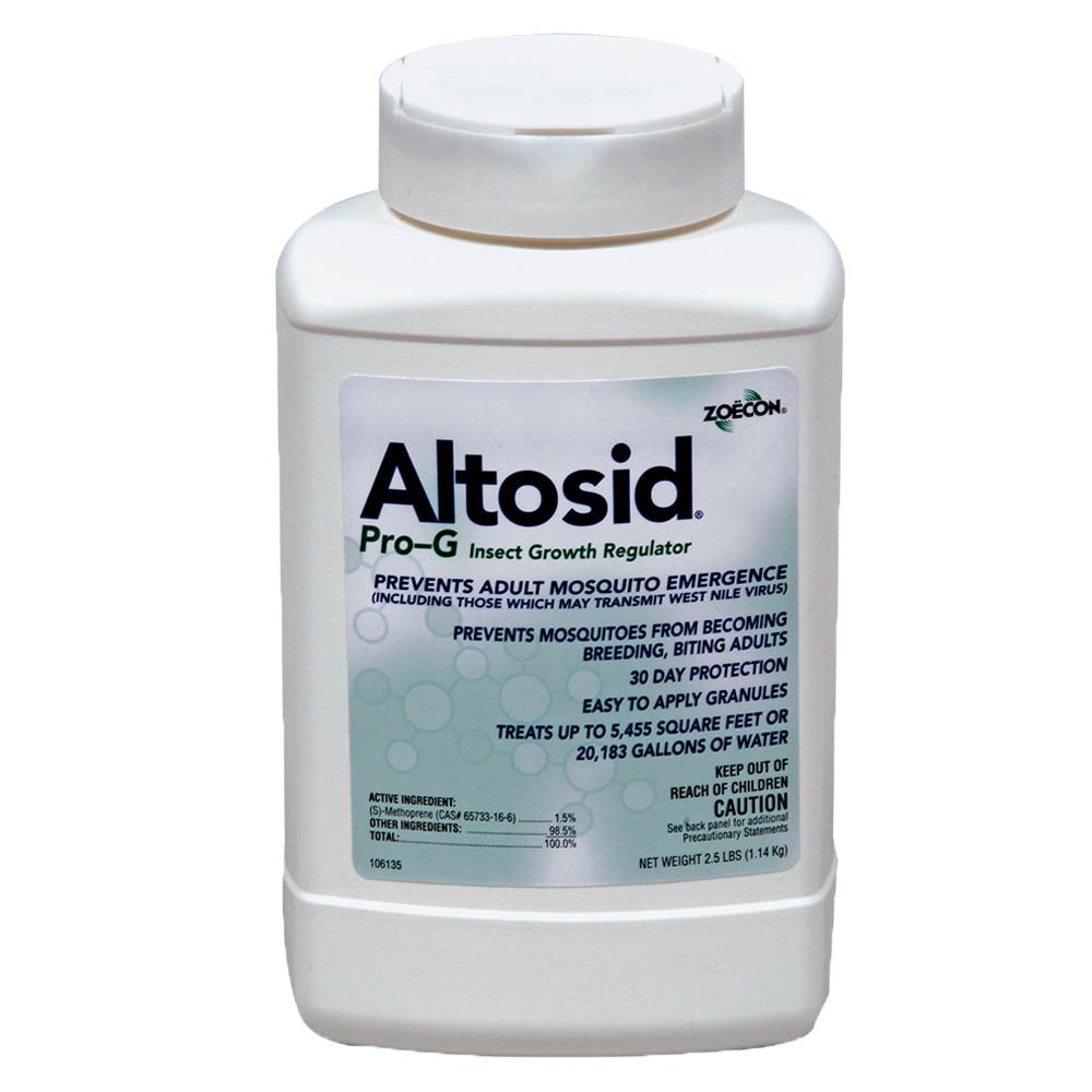 A granular mosquito larvicide, Altosid® Pro-G prevents adult mosquito emergence in treated areas. This backyard mosquito control solution features the insect growth regulator (IGR) (S)-methoprene. Altosid® Pro-G mosquito larvicide is formulated with extended residual control, providing up to 30 days of protection in standing water. Altosid® Pro-G includes convenient shaker top for easy application. It treats up to 5,455 sq ft or 20,183 gal of water and is approved to treat and prevent mosquitoes that can transmit West Nile virus, Zika virus, dengue fever, chikungunya, and other mosquito-borne diseases.