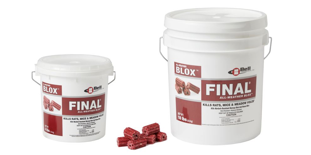 Final All-Weather Blox has a flavor and highly palatable formulation that rats and mice can’t resist. Final Blox rodent bait is made with more than 16 human food-grade ingredients for unsurpassed acceptance and control. Final Blox is the preferred bait of rats and mice when tested against other Brodifacoum baits on the market. The active ingredient brodifacoum is an anticoagulant, meaning that when it is ingested, the poison is transferred from the digestive system to the bloodstream, where it hinders clotting, causing eventual death.Â